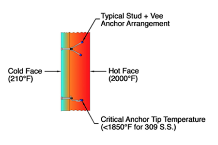 Standard practice for several years now has been to allow for expansion of the anchor tines by covering the anchor tips with plastic caps, dipping them in a wax, or putting tape on them. Metallic anchors expand at about three times the rate of alumino-silicate refractories. The expansion material affixed to the anchor tips burns out at low temperature and allows the anchor space to expand without causing cracks in the refractory.